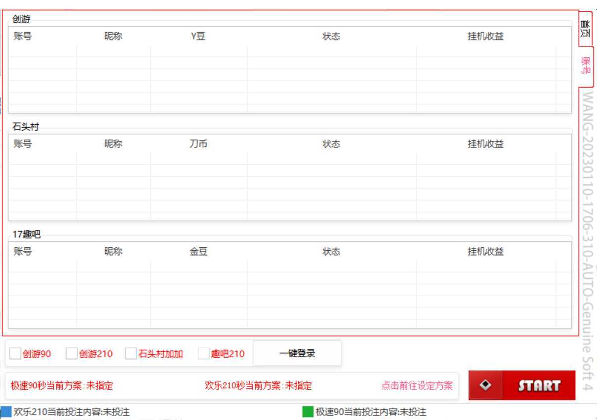 群控挂机脚本,支持多个账号同时挂机,自动方案自动挂机,包含石头村加加+创游90 210+趣吧210同时下注!!!